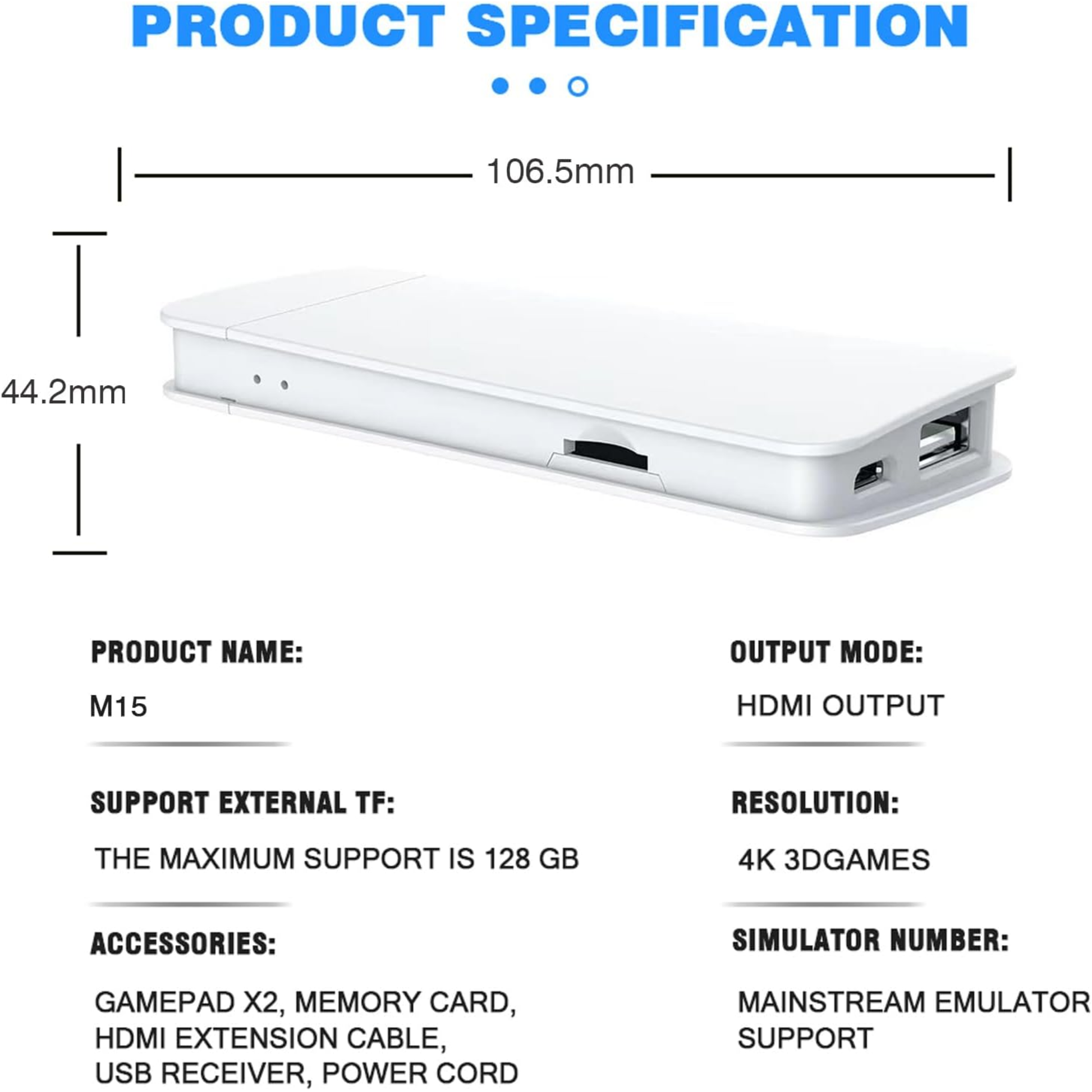 Relive the golden age of video games with the M15 wireless TV console. With a 64GB or 128GB game library and two 2.4G wireless controllers, this console offers a smooth, lag-free gaming experience. Simply connect it to your TV and enjoy classic games with friends and family. Designed for all ages, it encourages hand-eye coordination and cognitive skills, while providing hours of entertainment. Perfect for both casual gamers and retro gaming enthusiasts!
